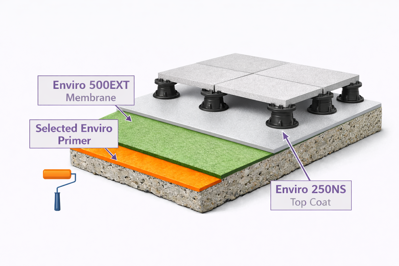 Enviro 500EXT was selected as the primary waterproofing membrane beneath the tiled finish. Its elastomeric formulation provided excellent adhesion to the prepared substrate while accommodating structural movement and minor cracking. The seamless, liquid-applied system allowed effective detailing around balcony door thresholds, outlets, and perimeter upturns are common failure points in residential construction.