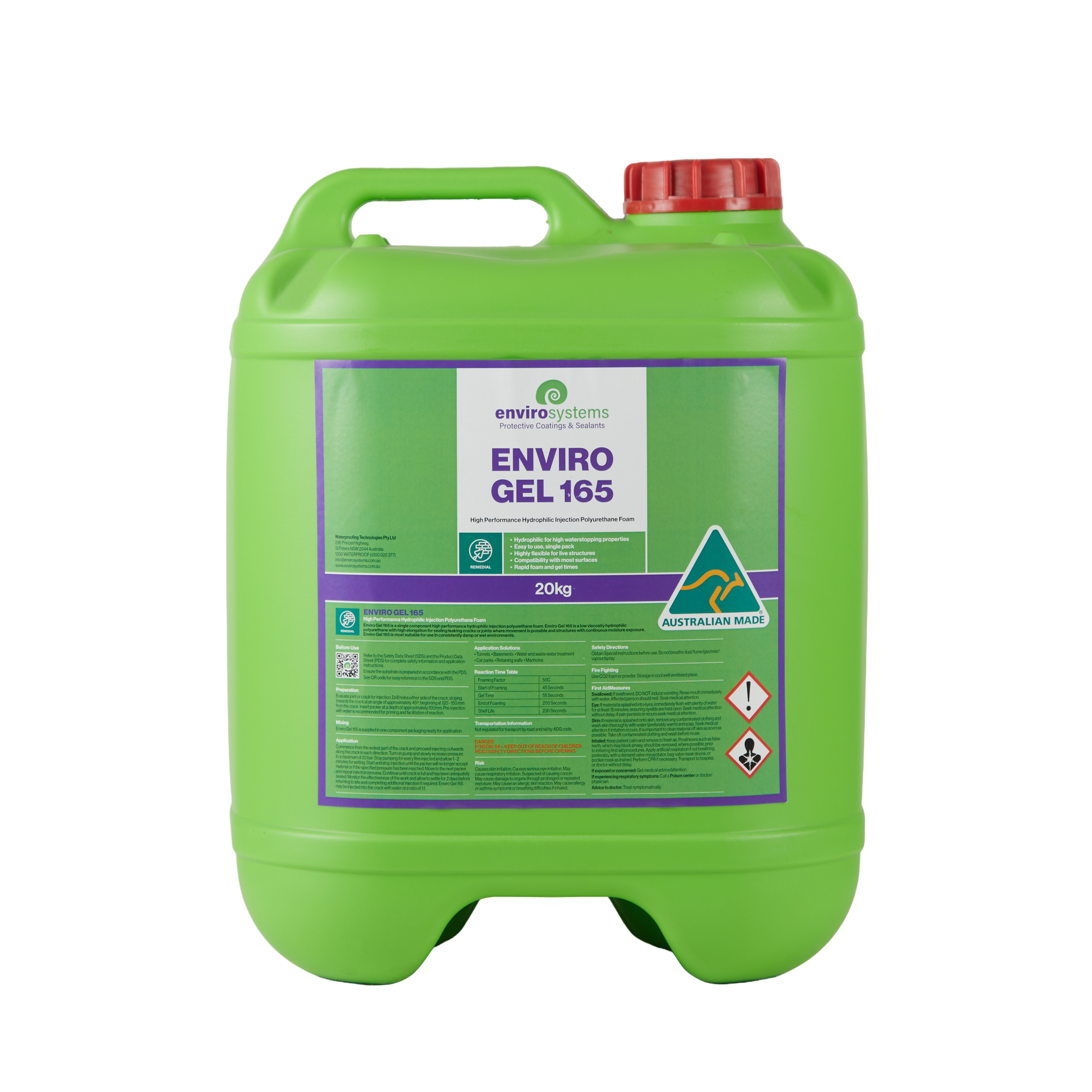 Enviro Gel 165 is a low viscosity hydrophilic polyurethane formula with high elongation properties for sealing leaking cracks or joints where movement is possible and structures with continuous moisture exposure. Enviro Gel 165 is typically used as a single component system (base resin) however Enviro Injection Gel Accelerator can be incorporated into the system for quicker reaction times. The accelerator can be used by experienced applicators to control the reaction time as warranted by the site conditions. Being a hydrophilic formulation, when reacted with water, the resulting foam will create a flexible seal with the injected repair.